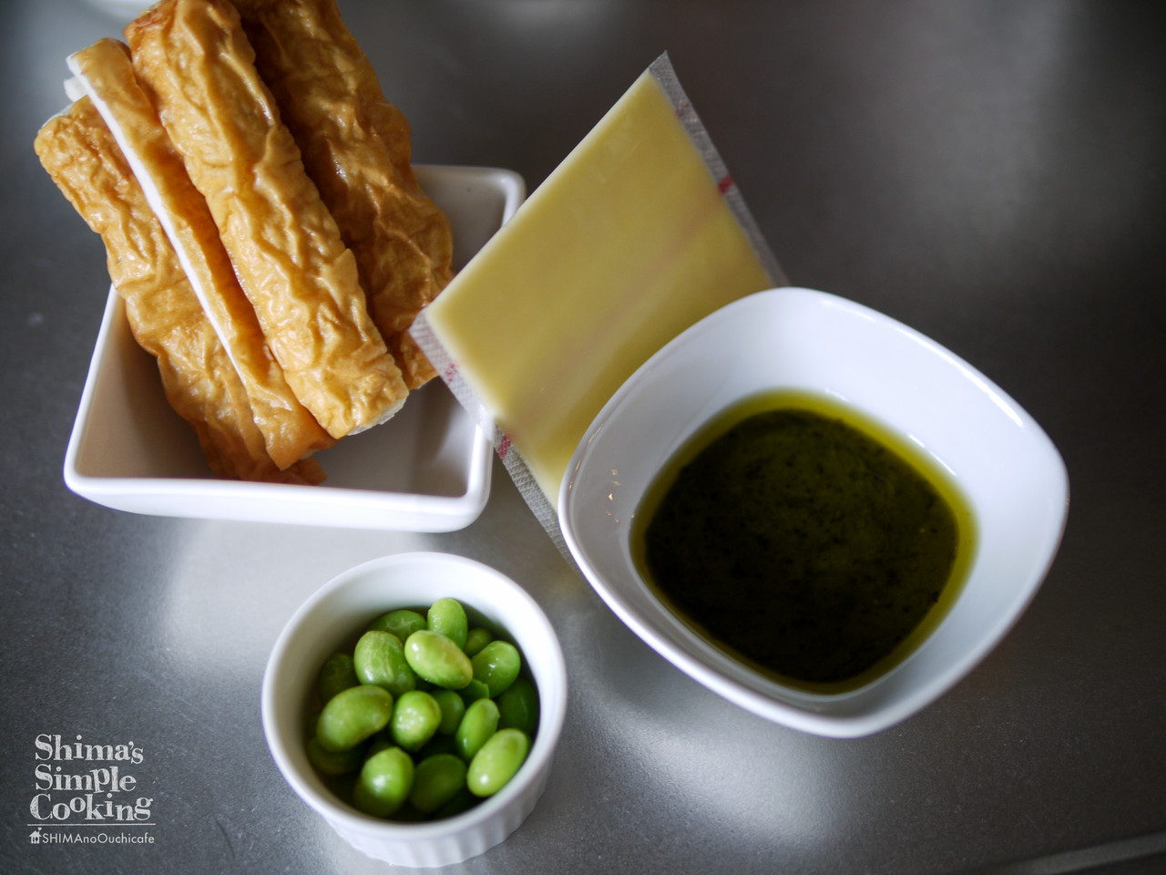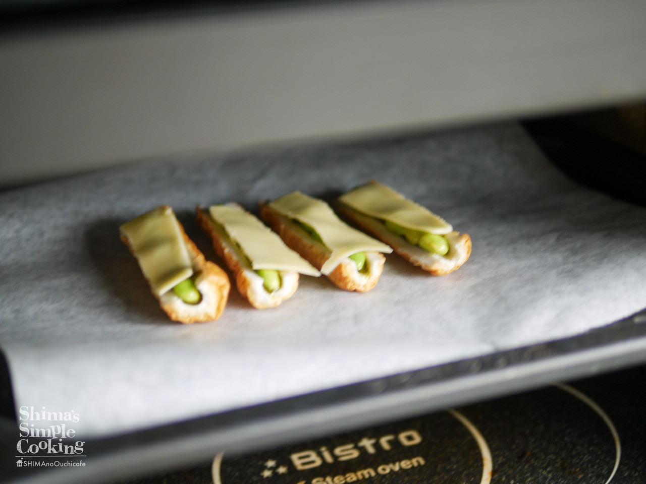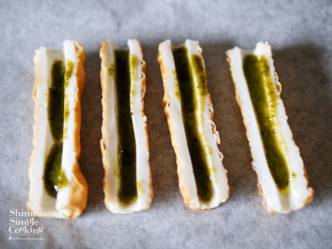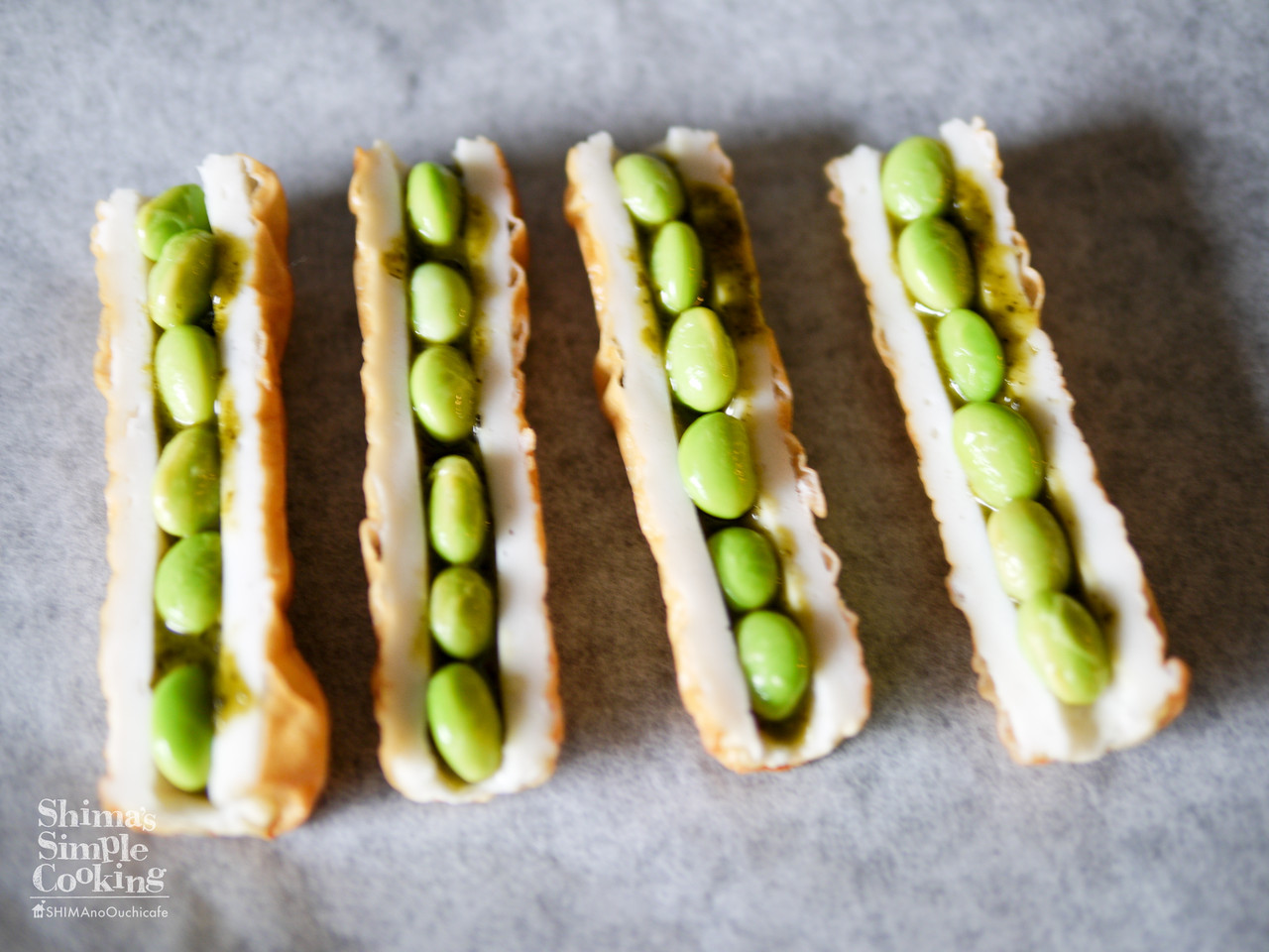 3、ジェノベーゼソース、むき枝豆、チーズをちくわに4等分ずつ乗せる。