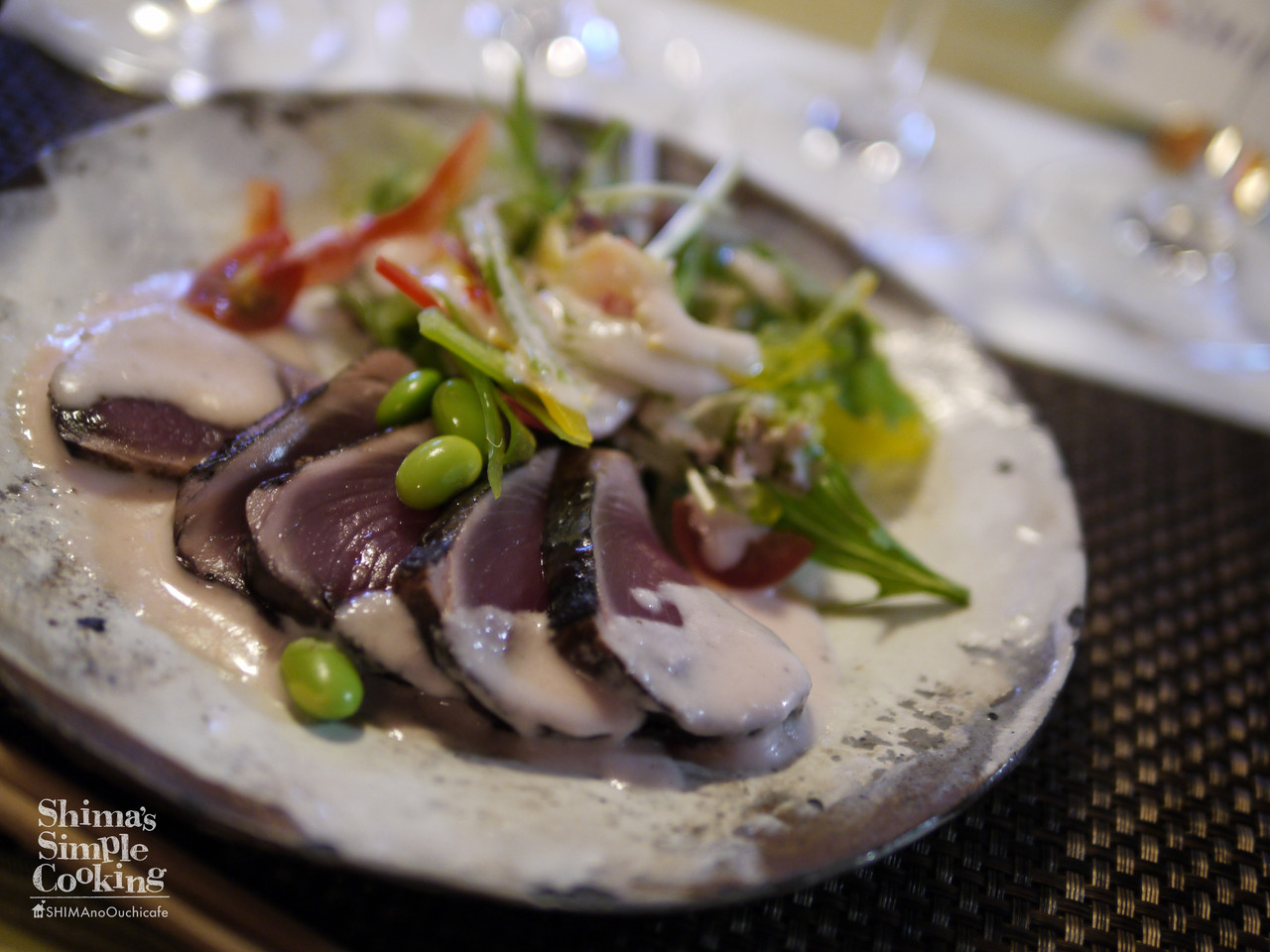 冷菜:高知より鰹の藁焼き サラダ添え 赤玉ねぎのドレッシングで