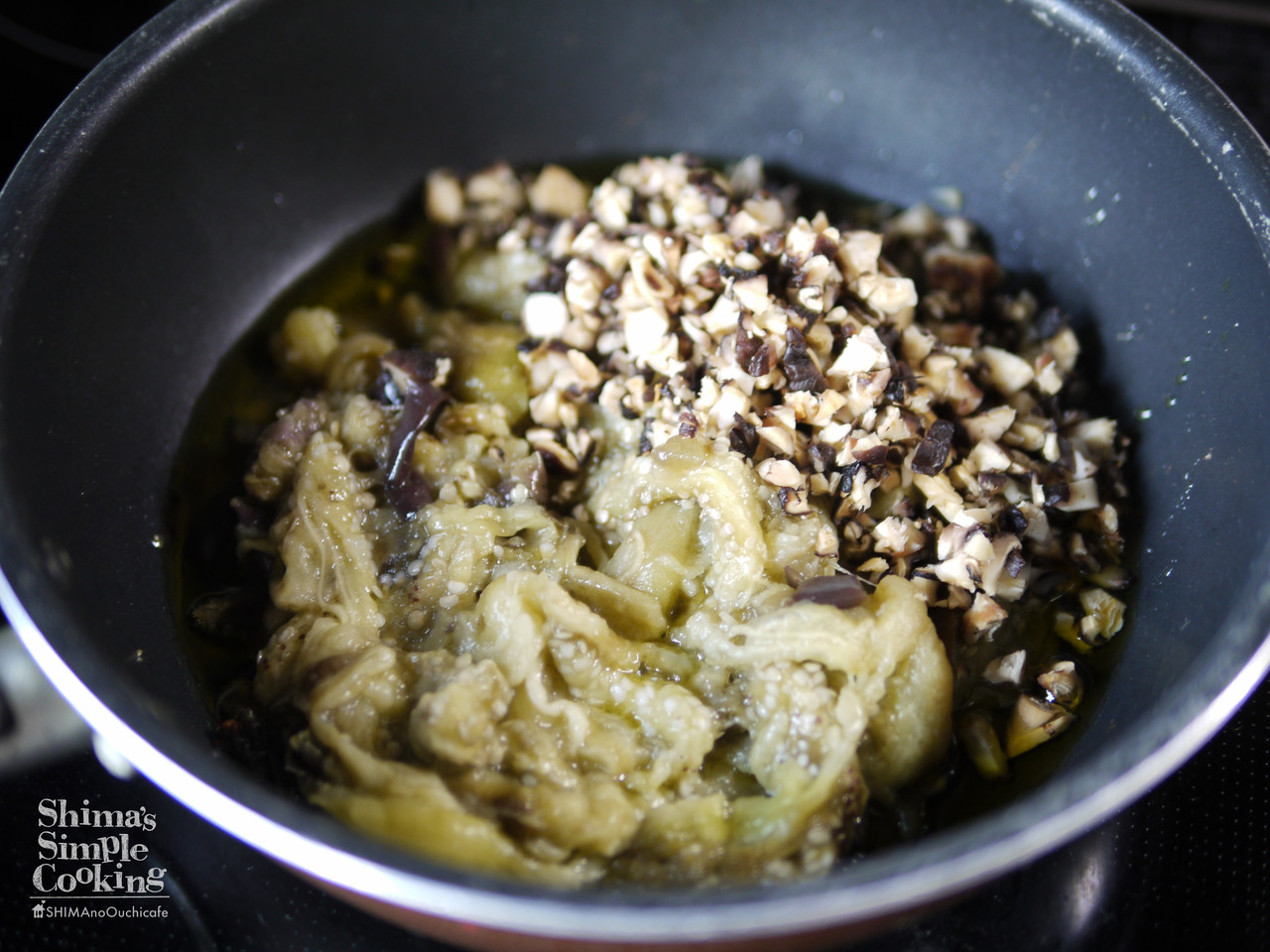 火にかけ、香りがたったらナスをナス、しいたけを加える
