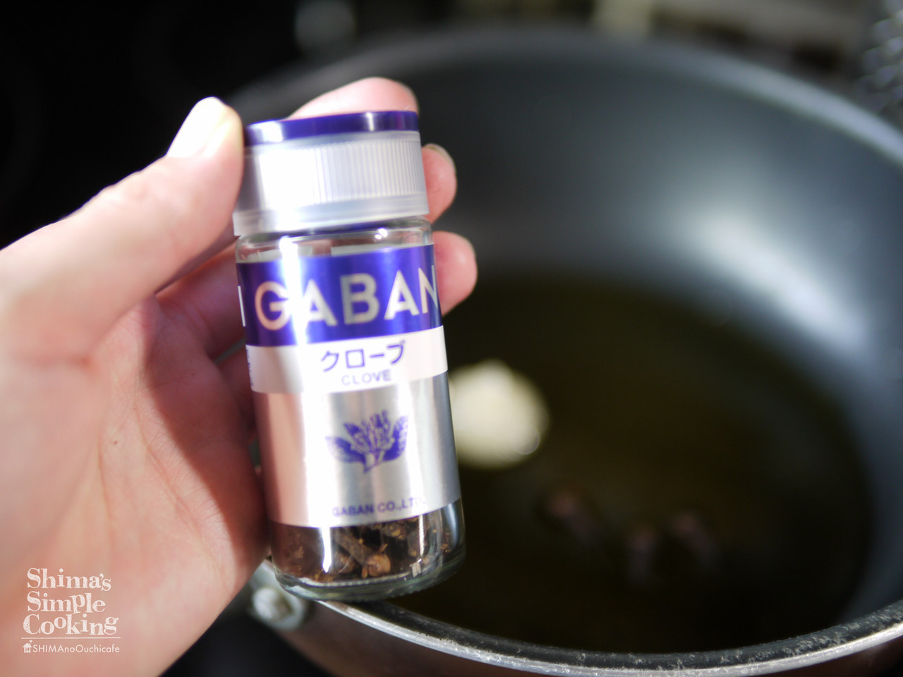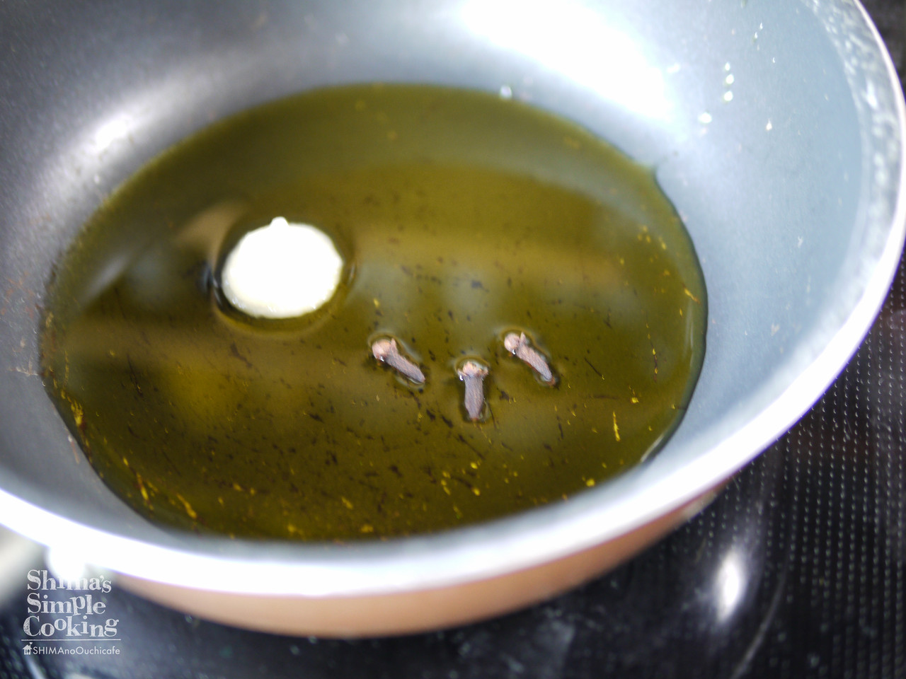 4、フライパンにオリーブオイル、おろしにんにく、クローブをいれ