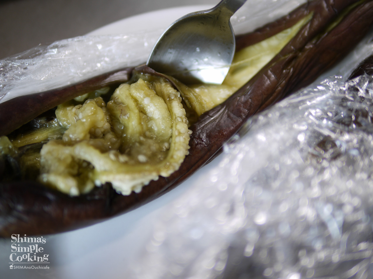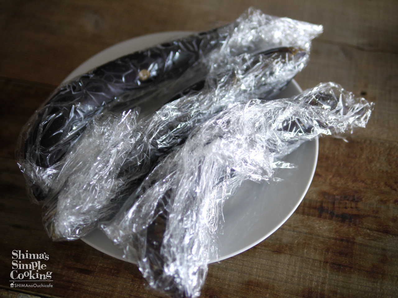 2、ナスはさっと水で洗いラップに包んで電子レンジ(600w)7分加熱