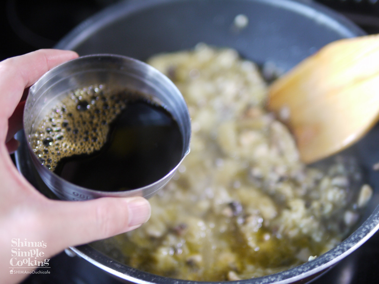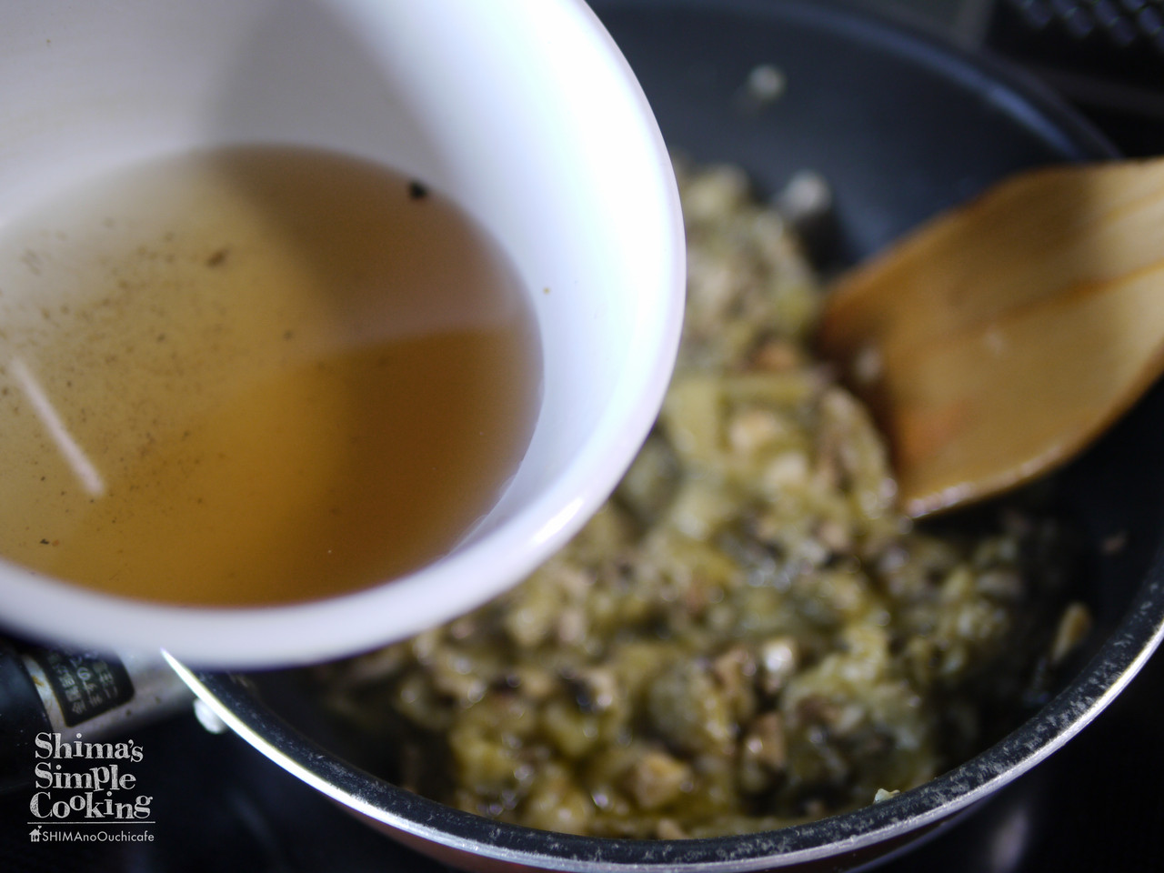 5、炒め合わせてポン酢と椎茸の戻し汁を加え、