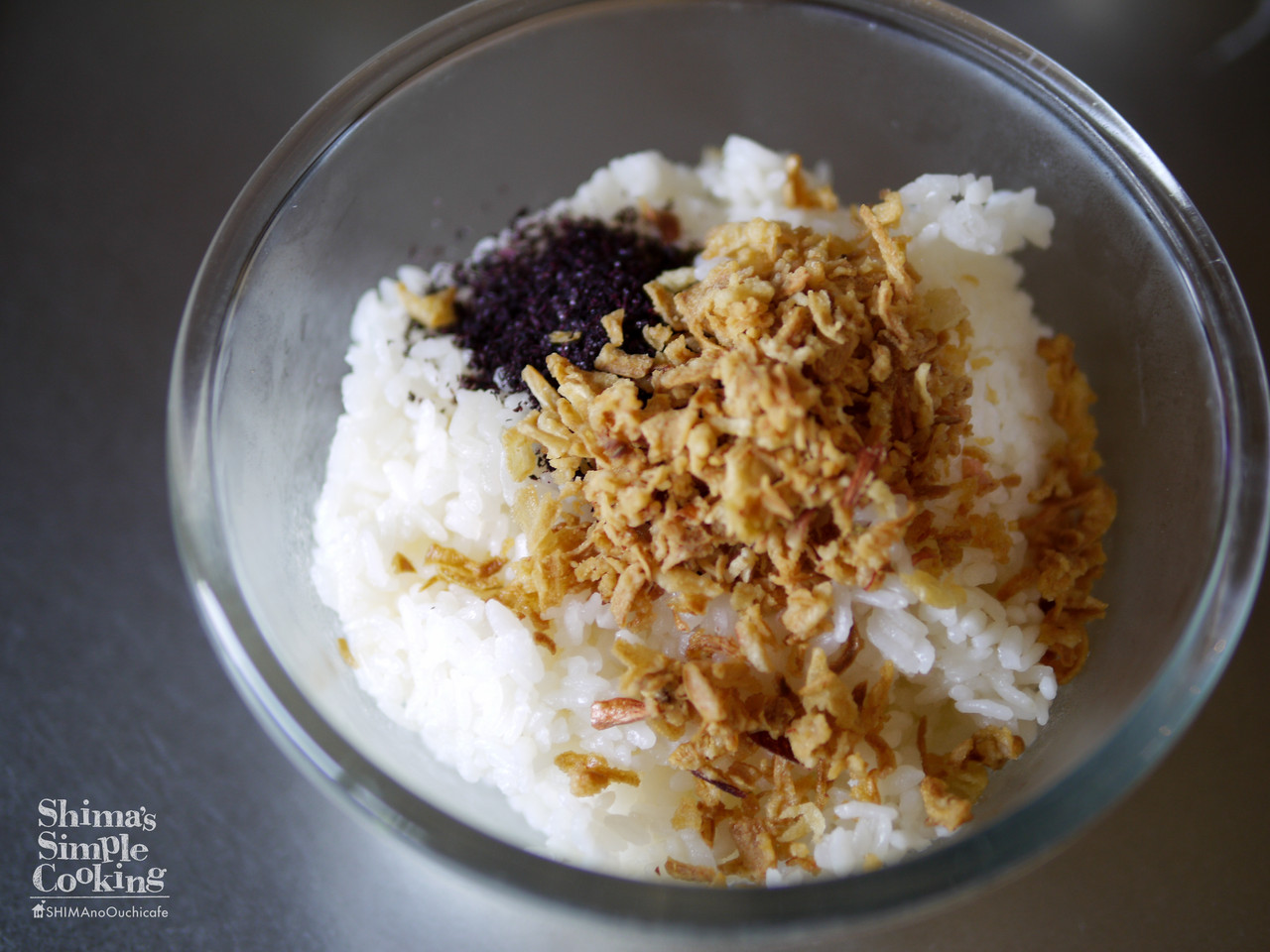 暖かいご飯にゆかりとフライドオニオンを合わせ混ぜ合わせます。