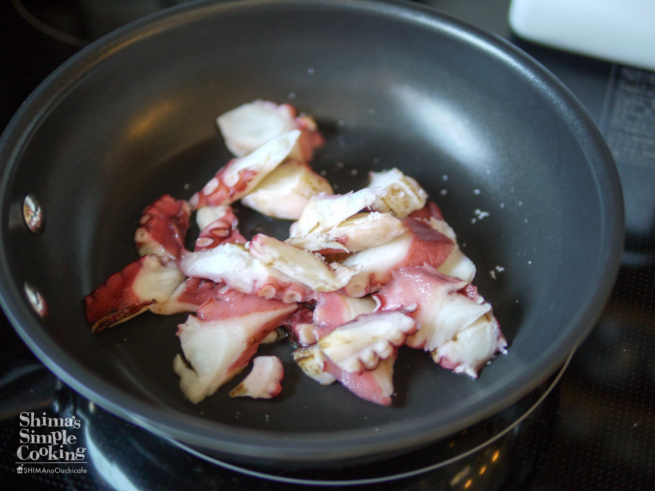 フライパンにごま油を熱してタコを炒めます。