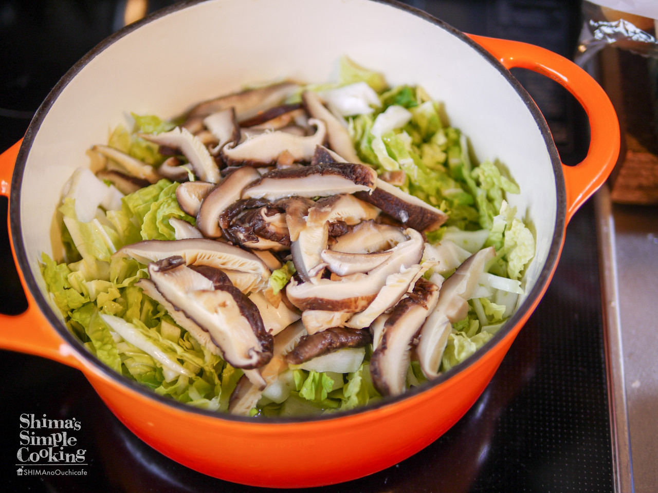 3、白菜と椎茸を鍋に入れ中火にかける。