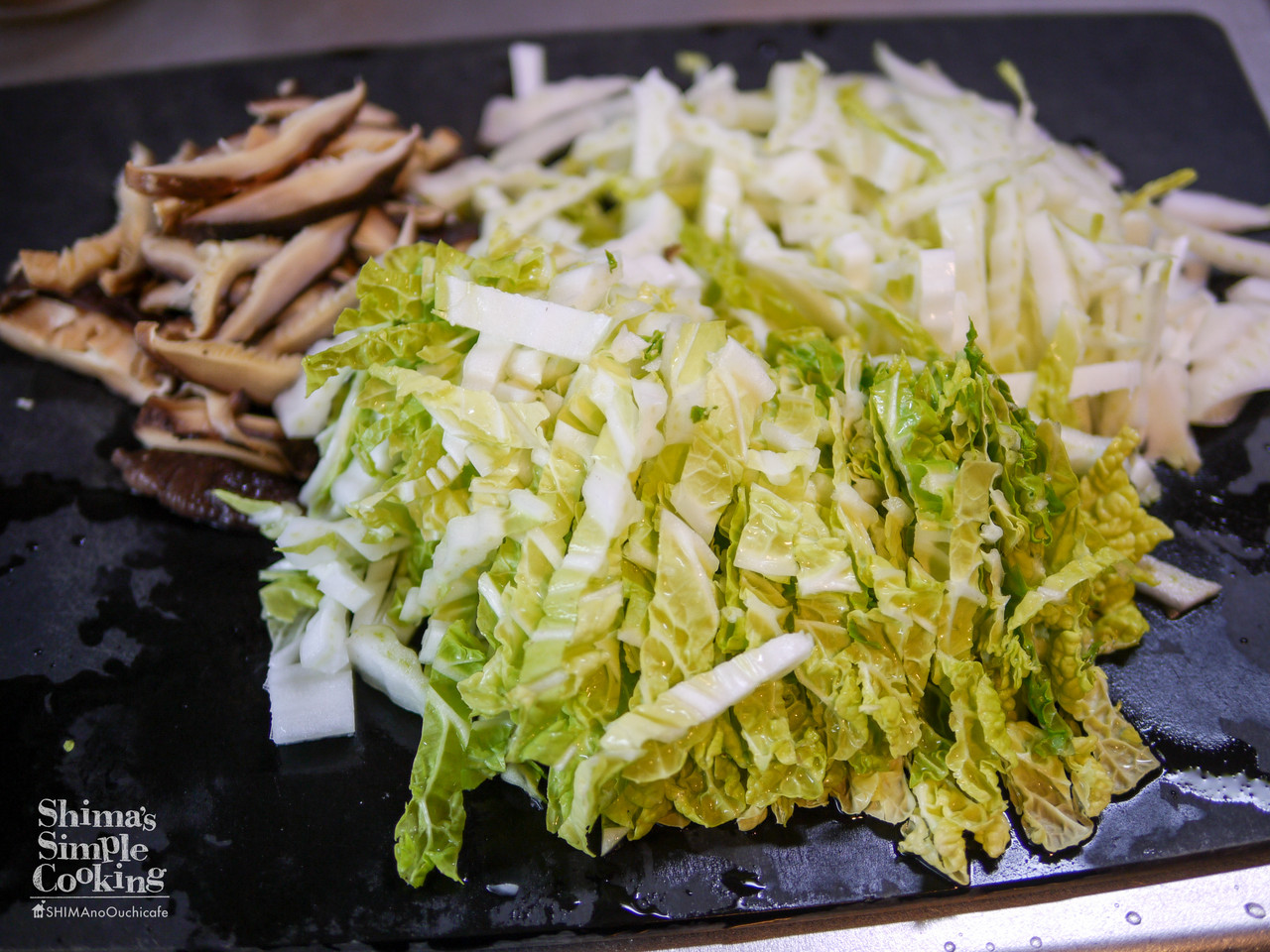 1、白菜と椎茸は千切りにする。
