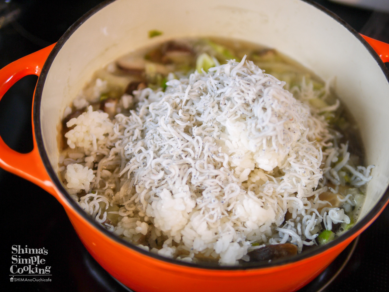 4、野菜に火が通ってくったりなったらご飯と“おじゃこ”を加え混ぜる。