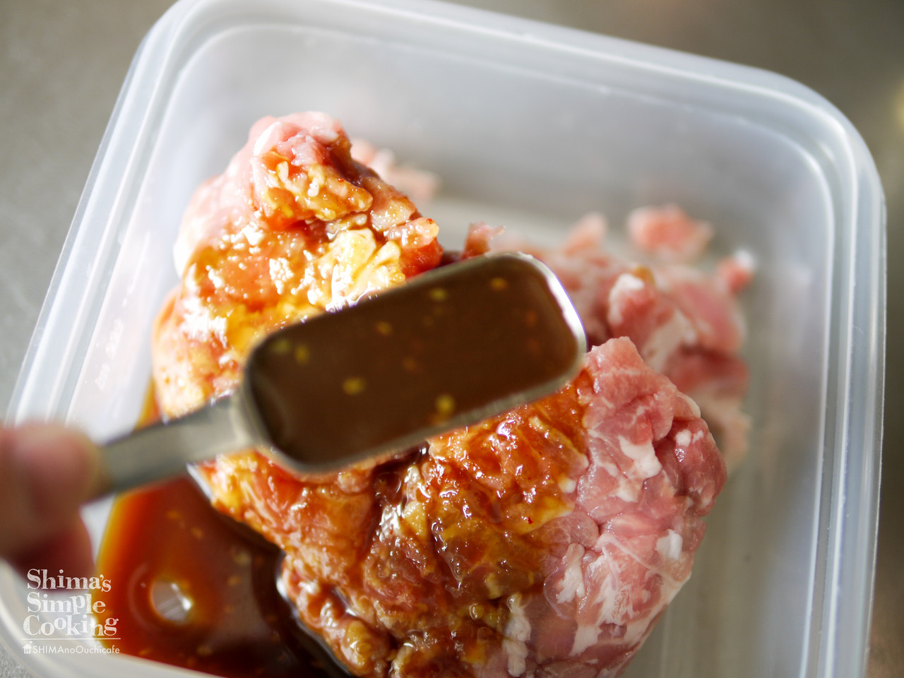 1、豚細切れ肉をボウルなどに入れ焼肉のタレを絡めて5分ほどおきます。