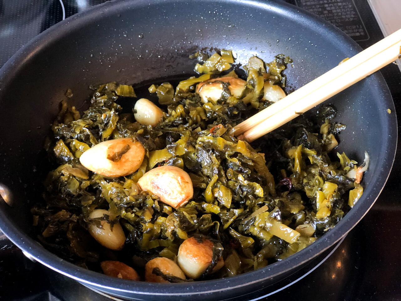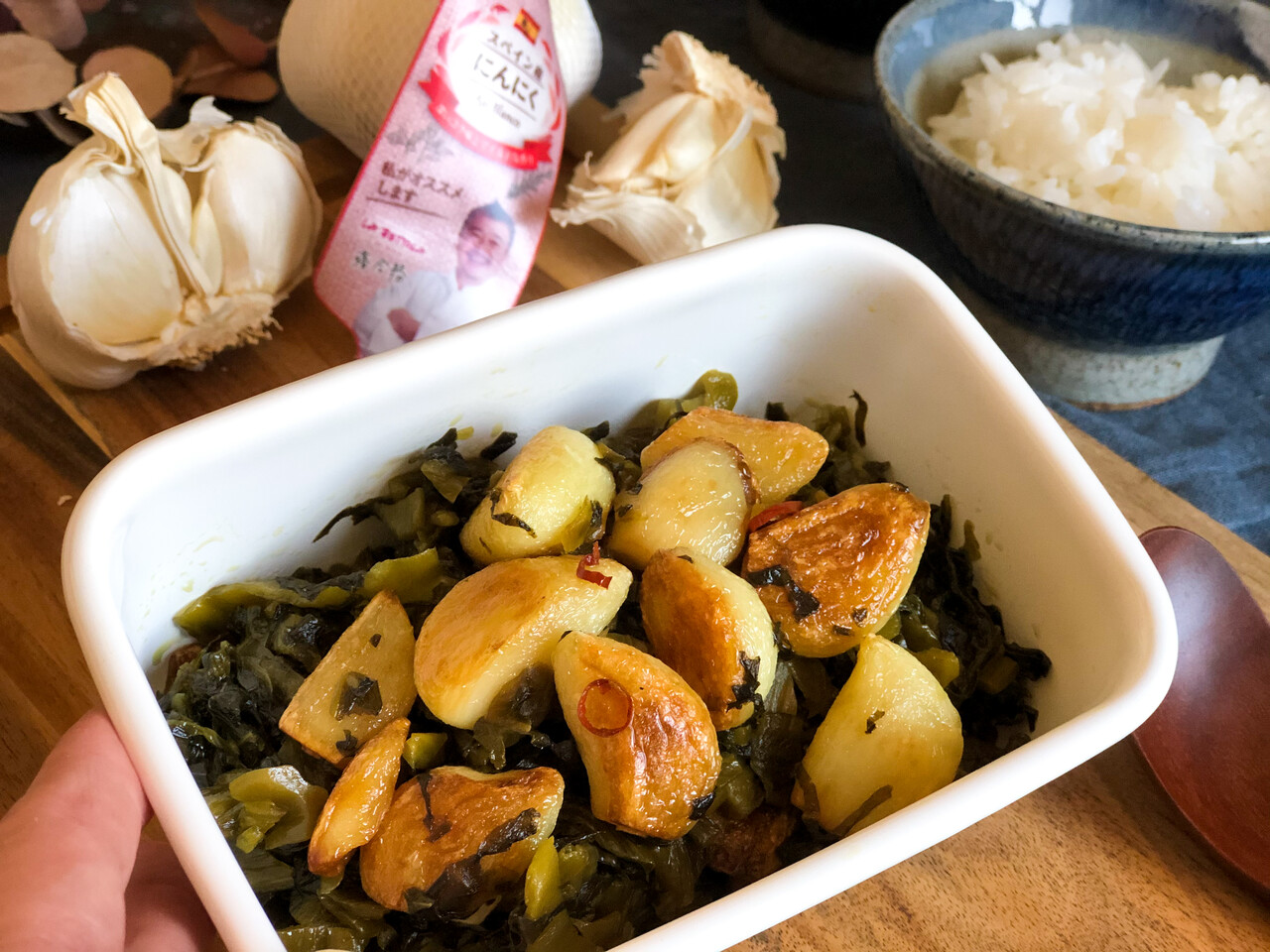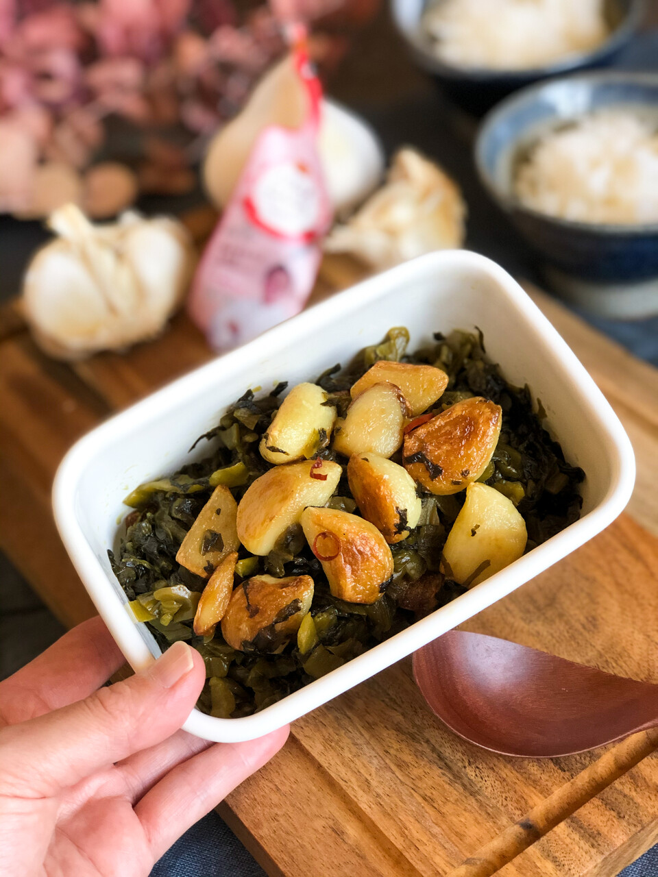ゴロゴロにんにくを入れた高菜の油炒めに。