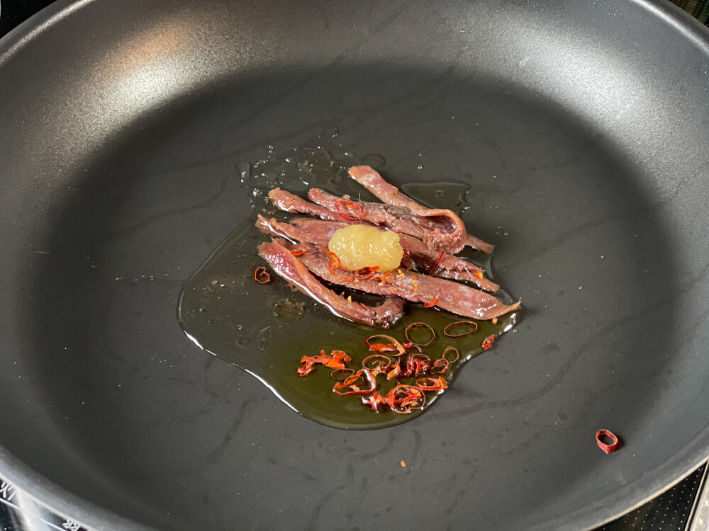 アンチョビとガーリックでペペロン炒めにしてみたよ!