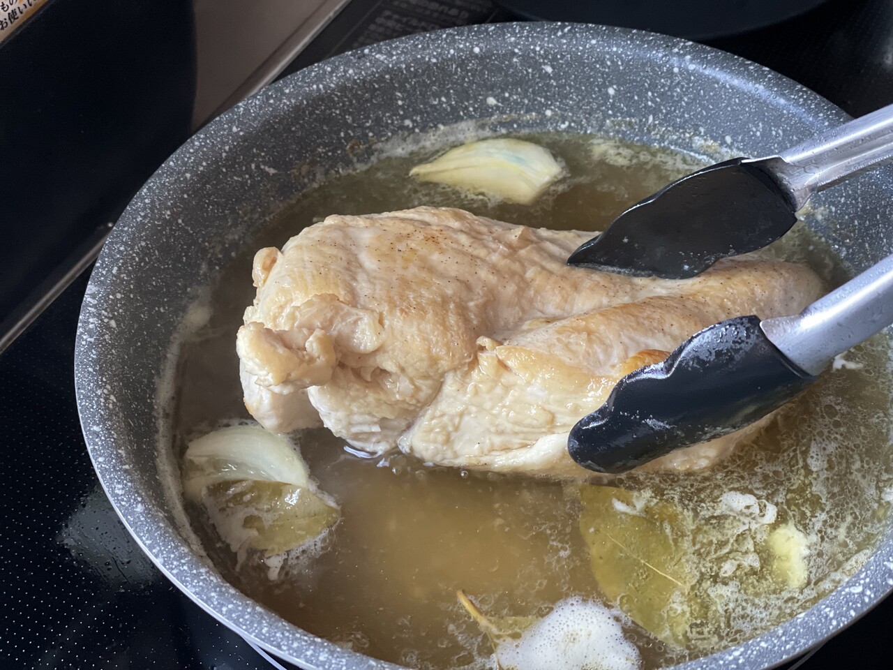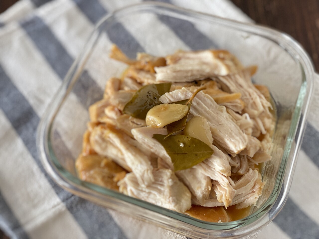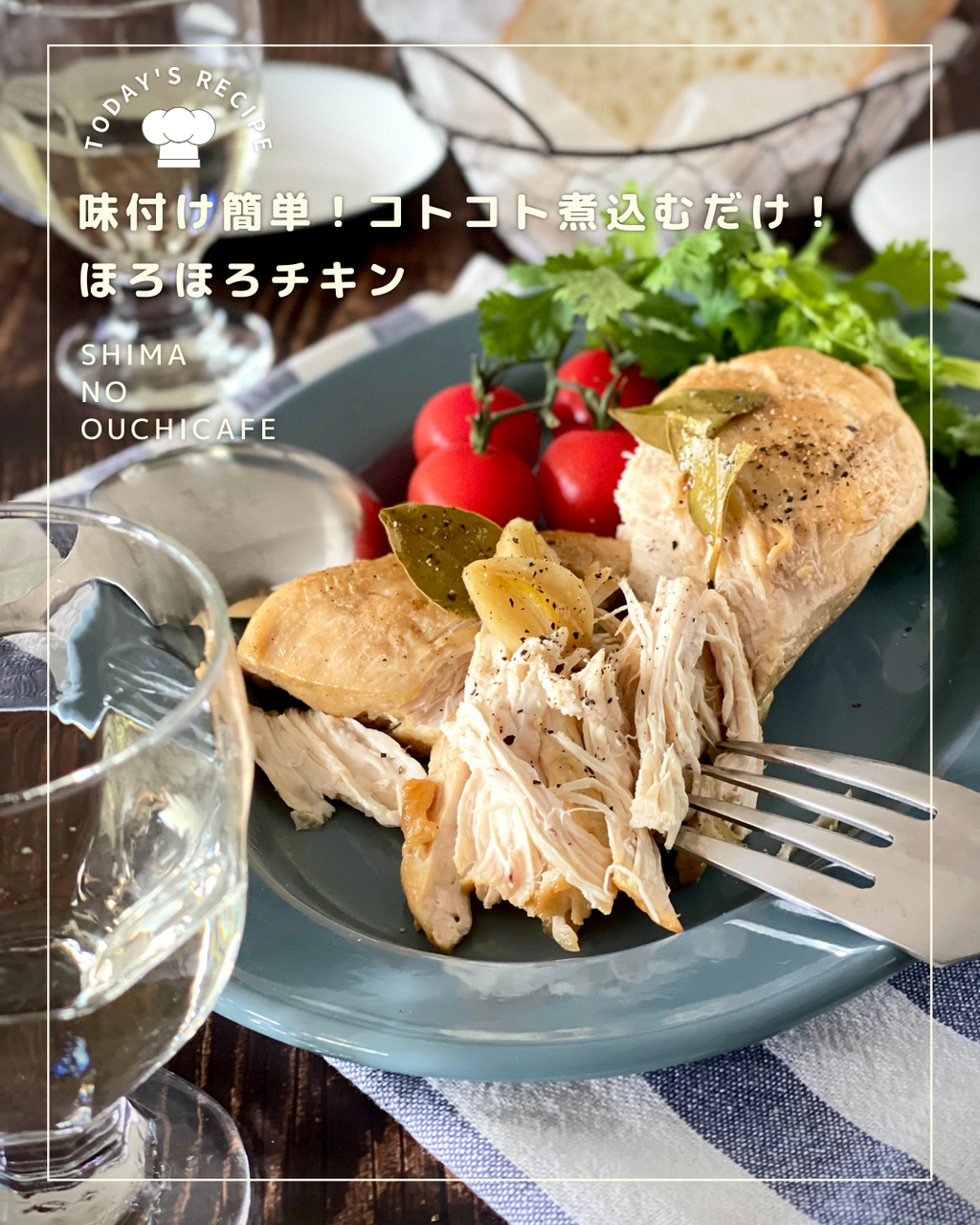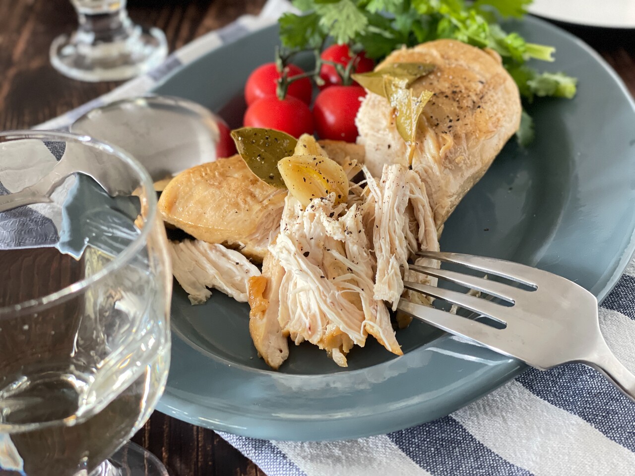 ニンニクとローリエの風味を合わせて白ワインでコトコト煮るだけ。