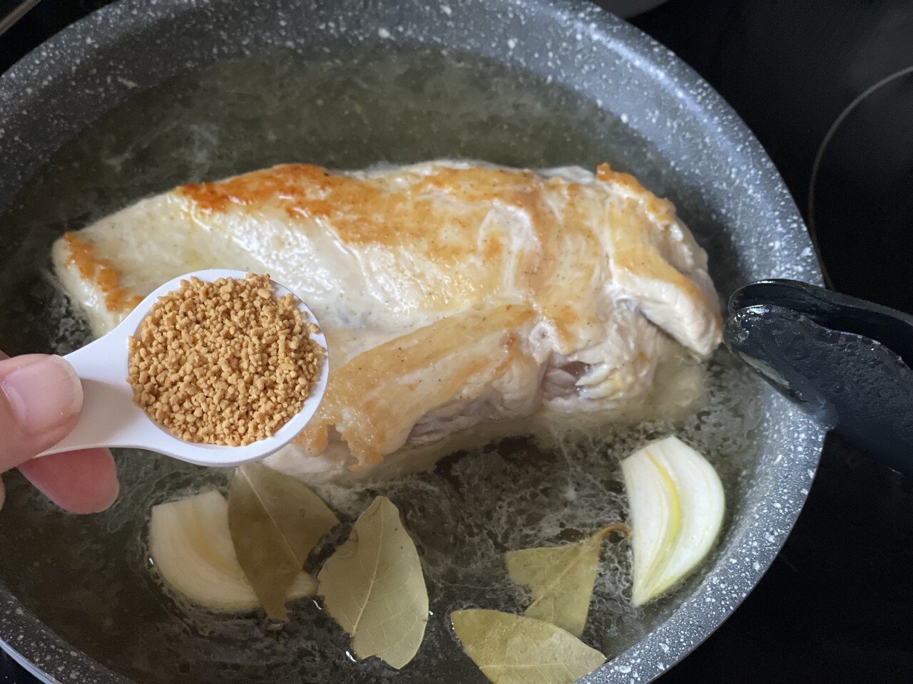 カリッと焦げ目をつけたら白ワインでコトコト煮るだけ。