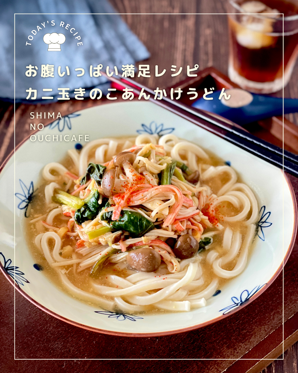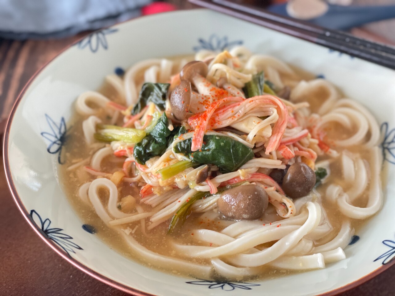 ヘルシー&節約食材のカニカマもたっぷり具材満点なうどんです。
