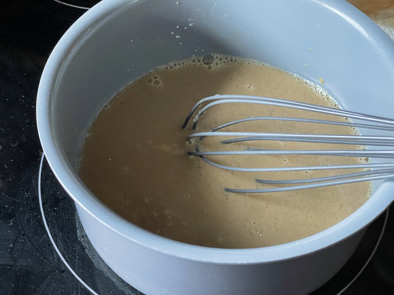 中火にかけてとろ〜とするまで混ぜながら、火にかけます。