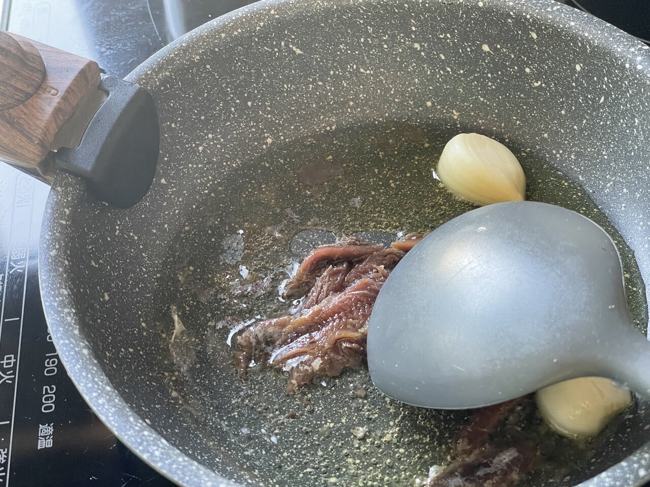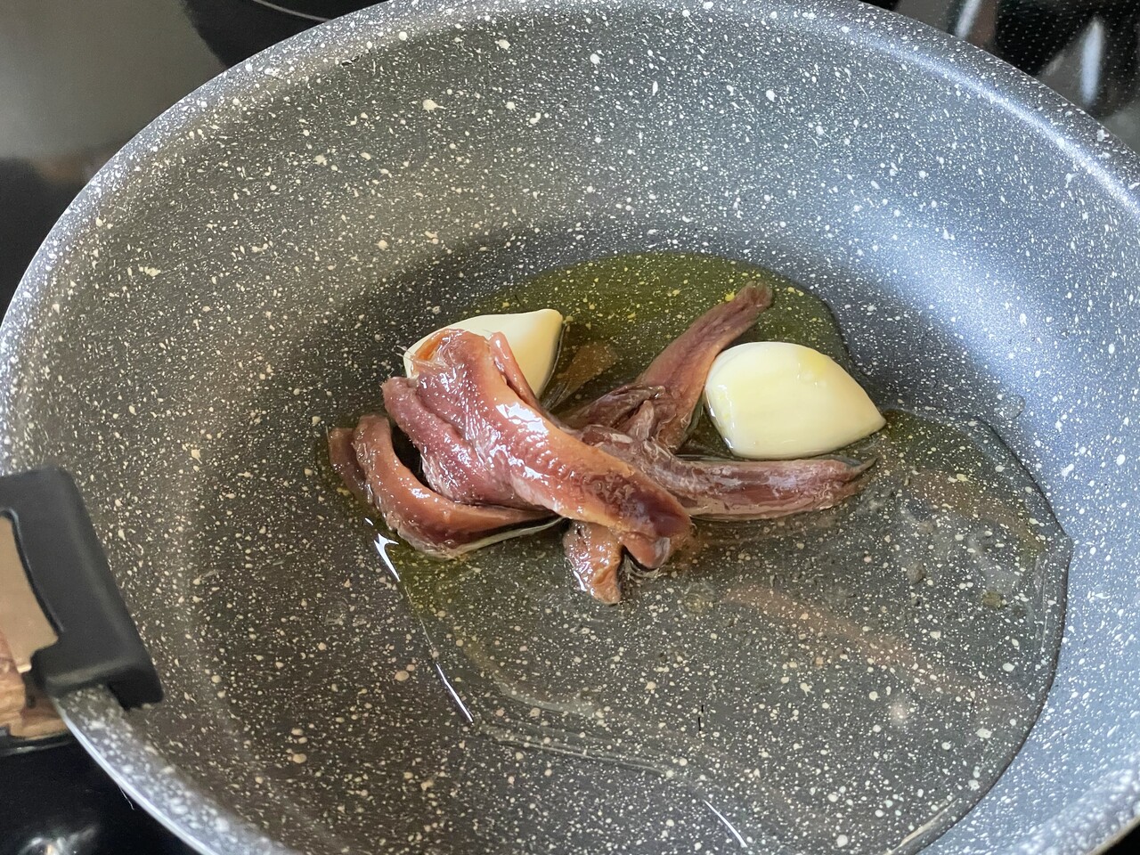 味付けはアンチョビ缶で楽チン化!オイルごとつかってニンニクを合わせて火にかけます。