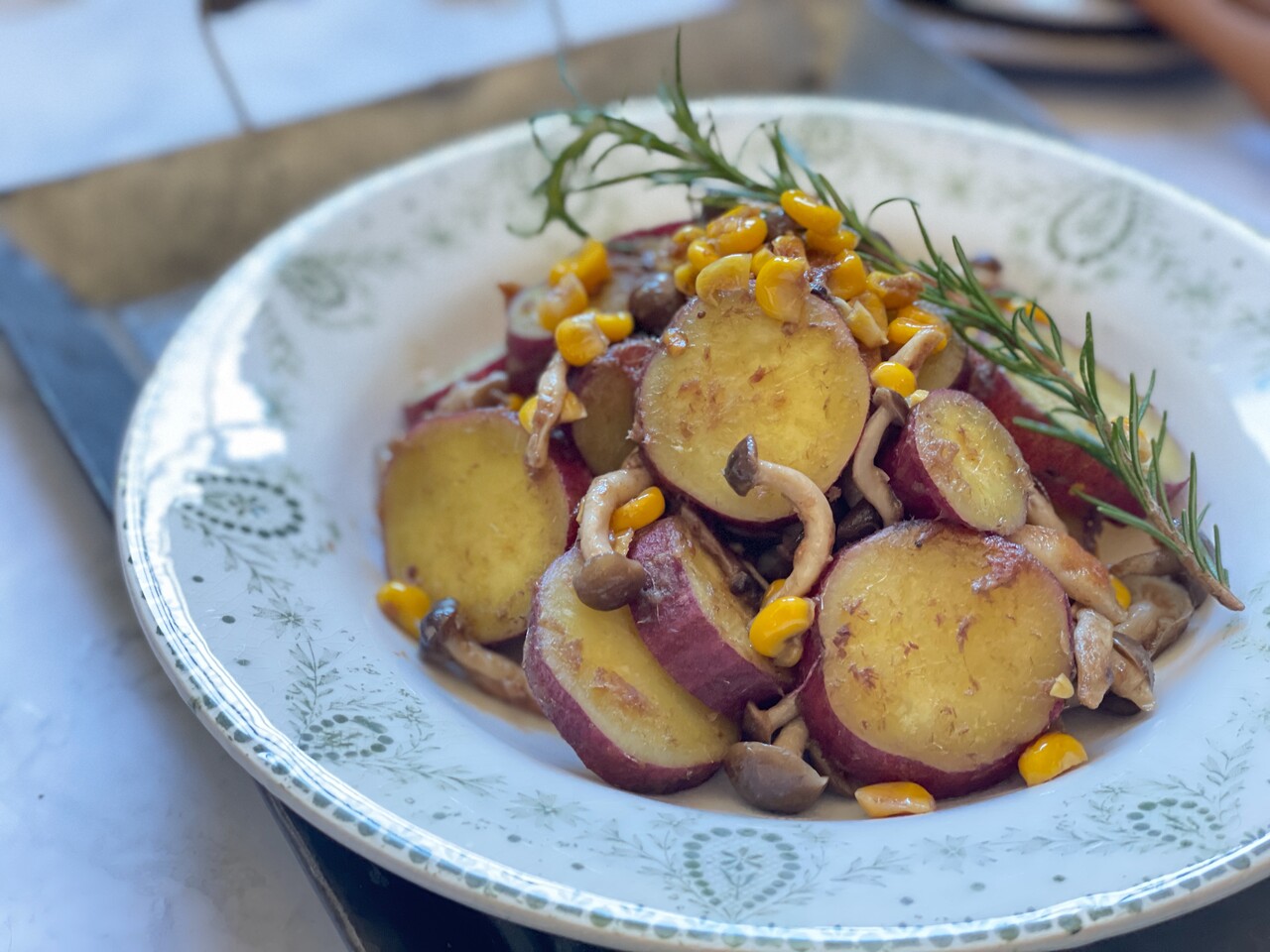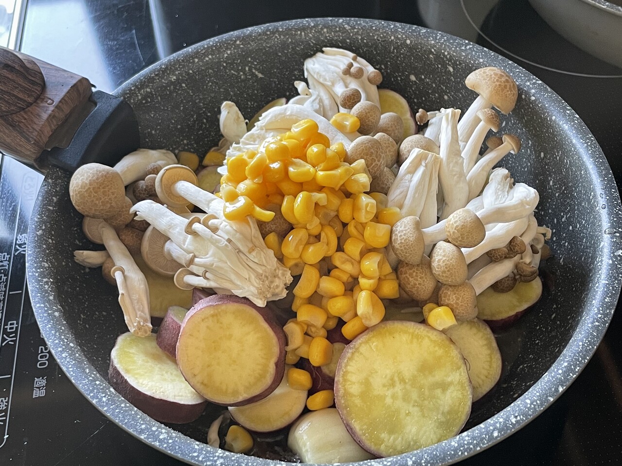 さつまいも、しめじ、コーンを入れて全体に油が馴染んだら