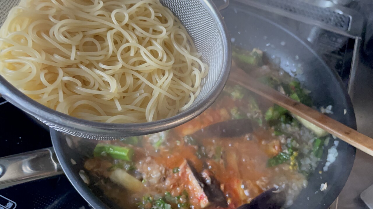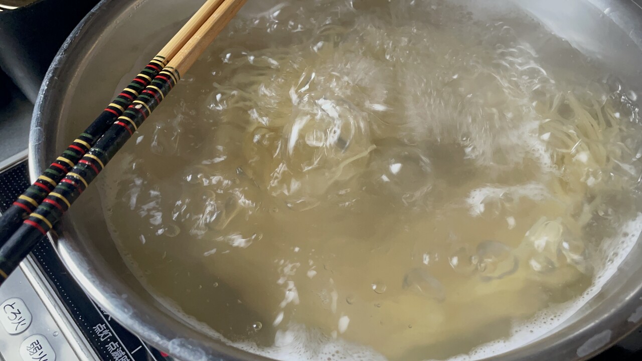水 2リットル、塩 大さじ1くらいで茹でます。