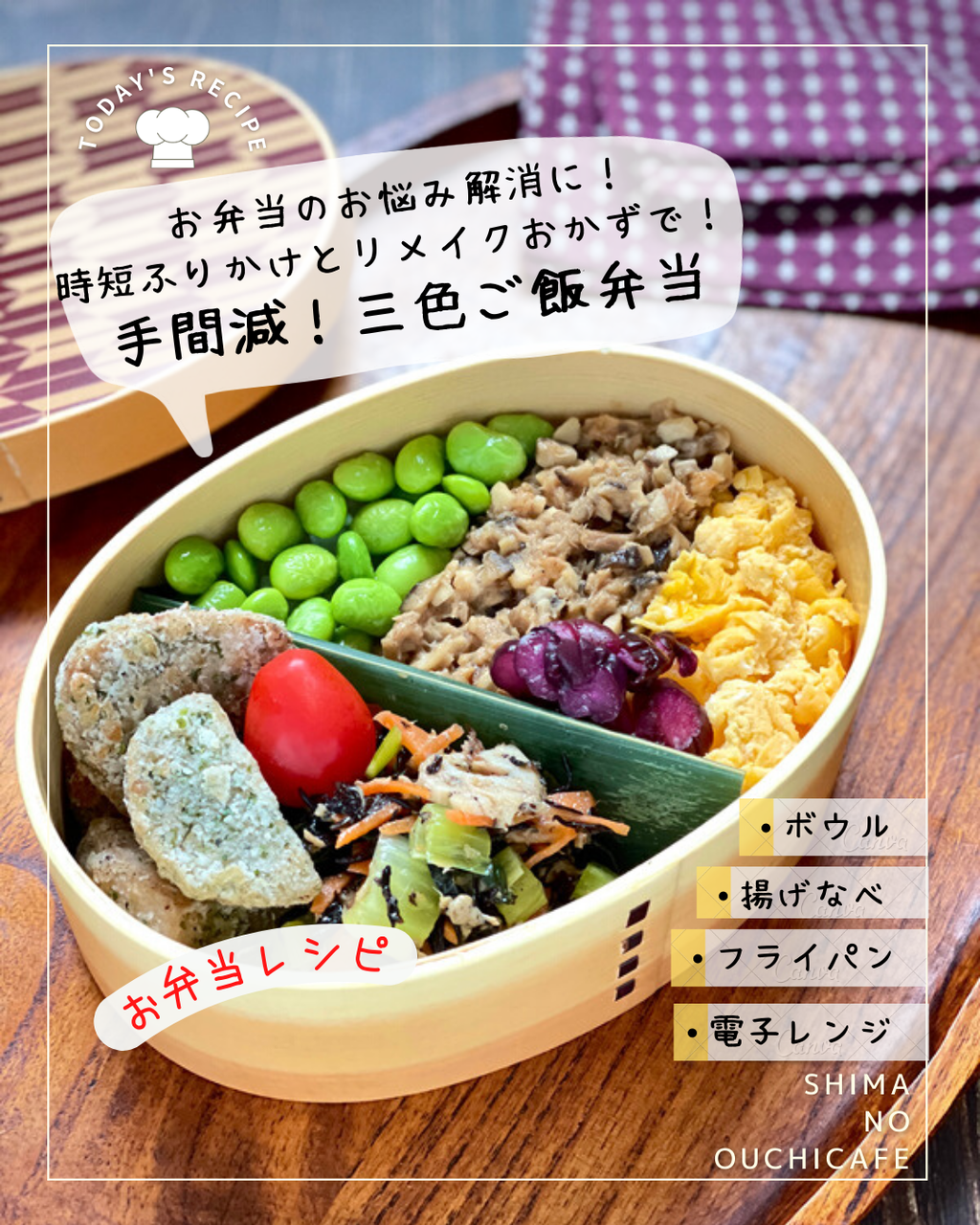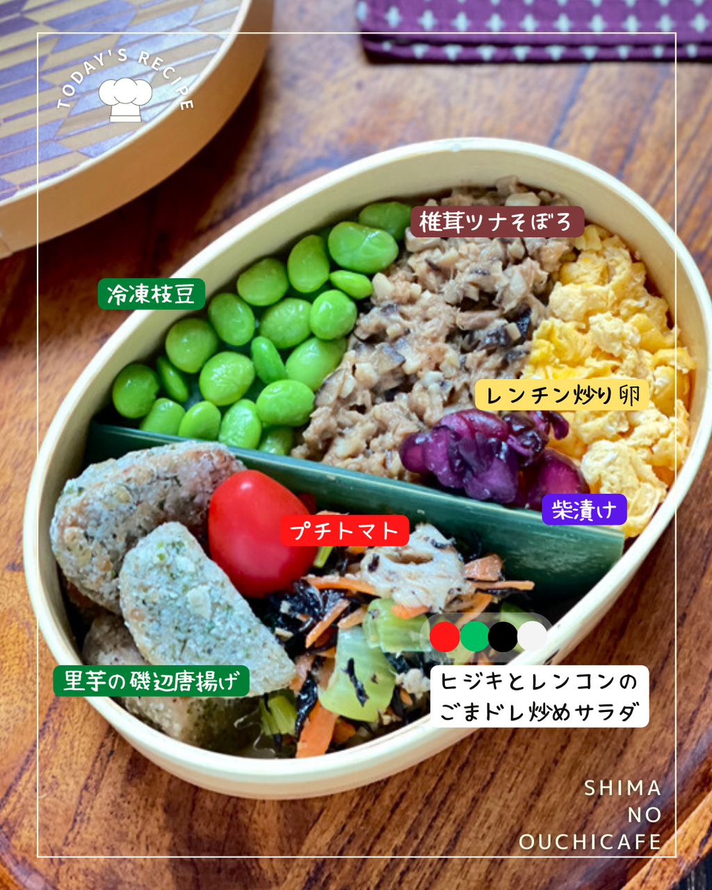 椎茸ツナそぼろ、レンチン炒り卵、枝豆