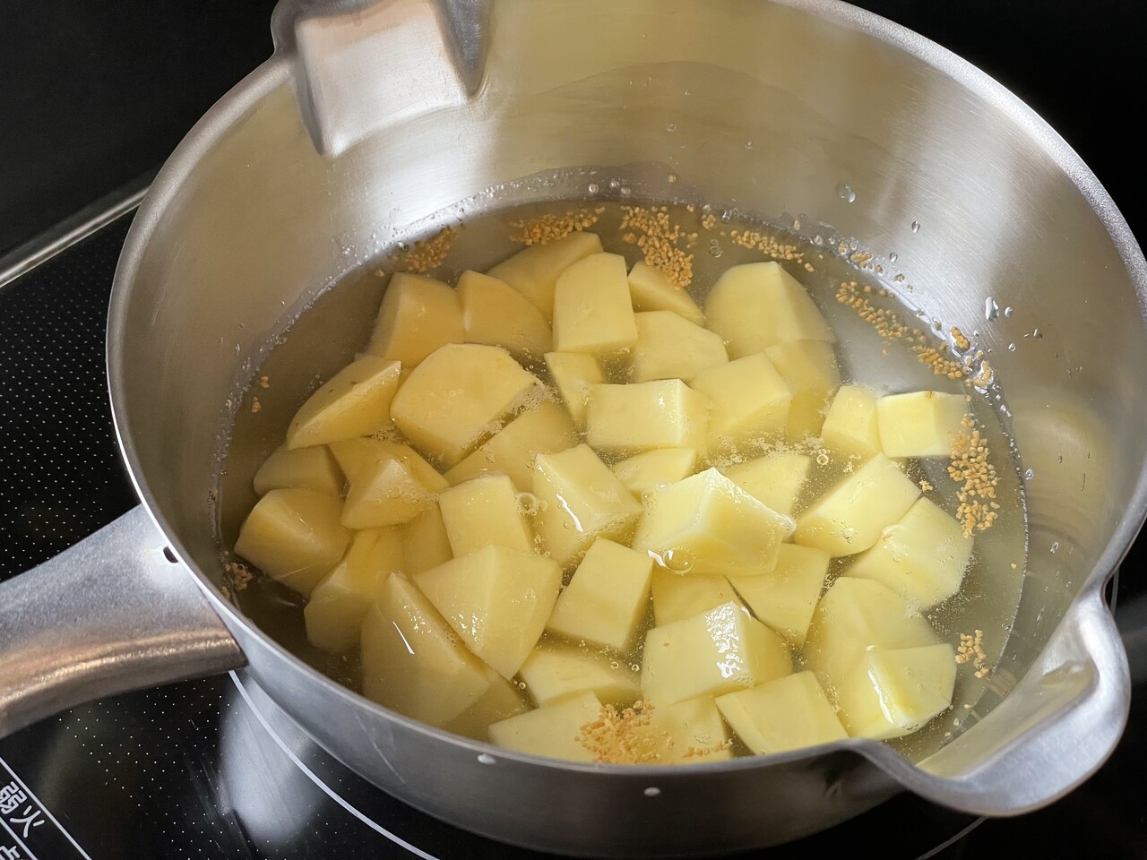 粉ふきいもを作るタイミングでジャガイモにコンソメ味を染み込ませます
