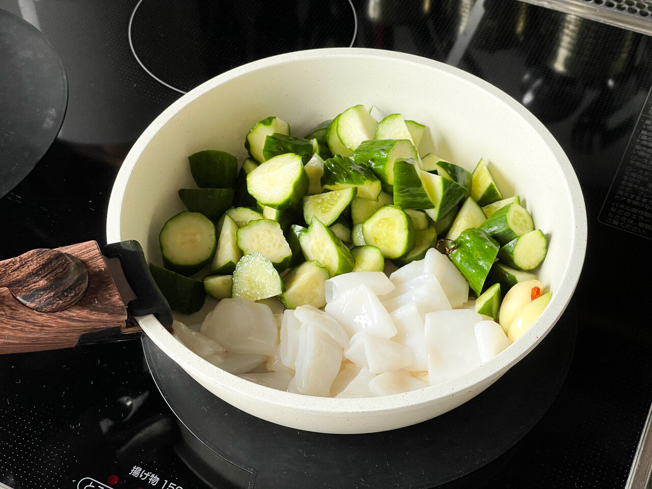 ❷香りが立ってきたらイカときゅうりを加え炒める