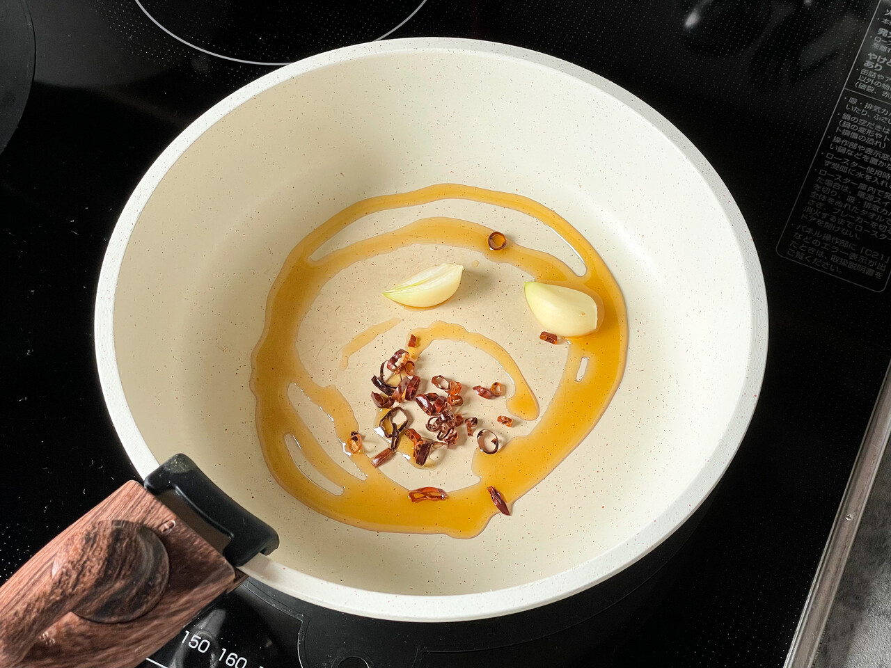 ❶フライパンにごま油、輪切り唐辛子、