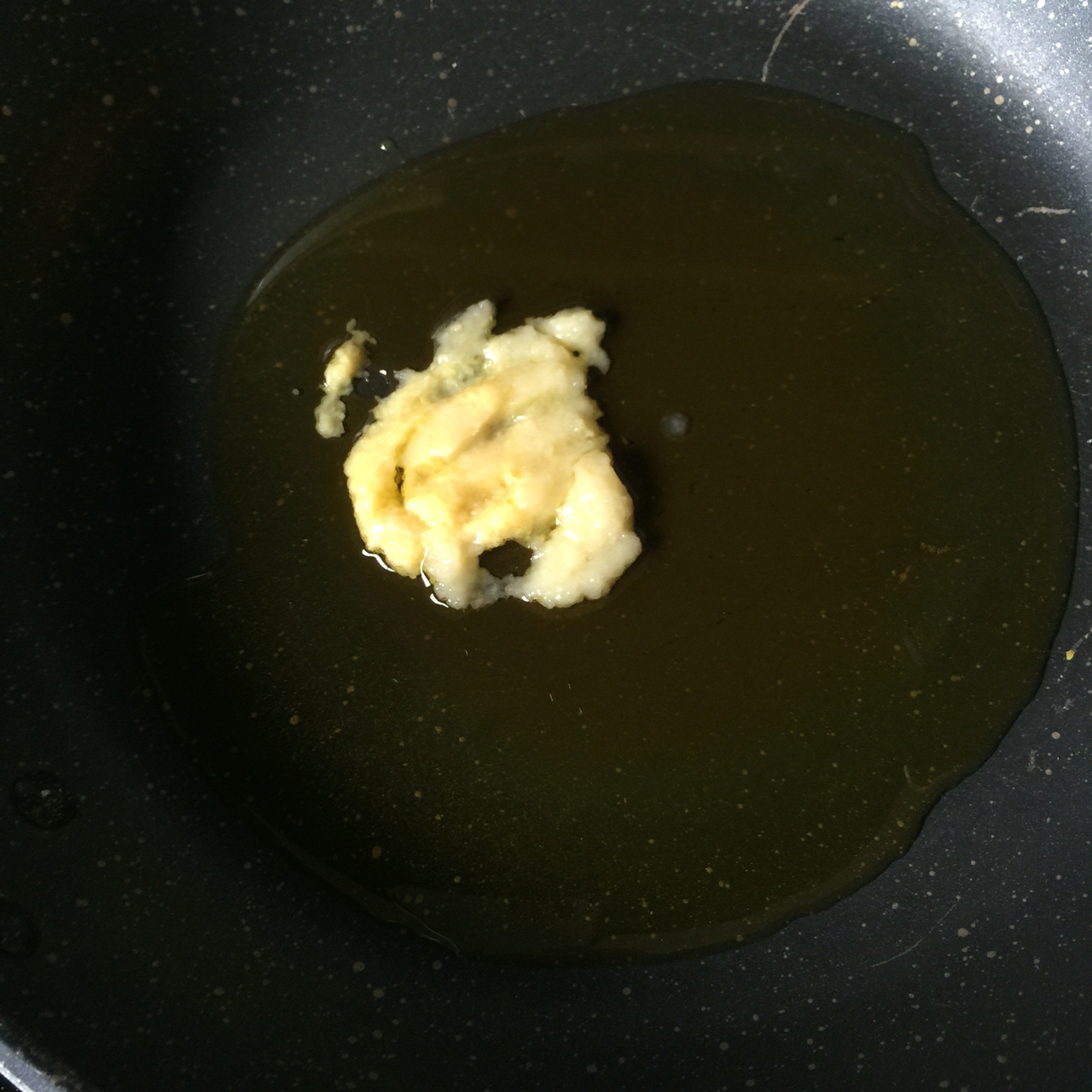 フライパンにオリーブオイル、おろしニンニク、おろし生姜をいれ火にかけ