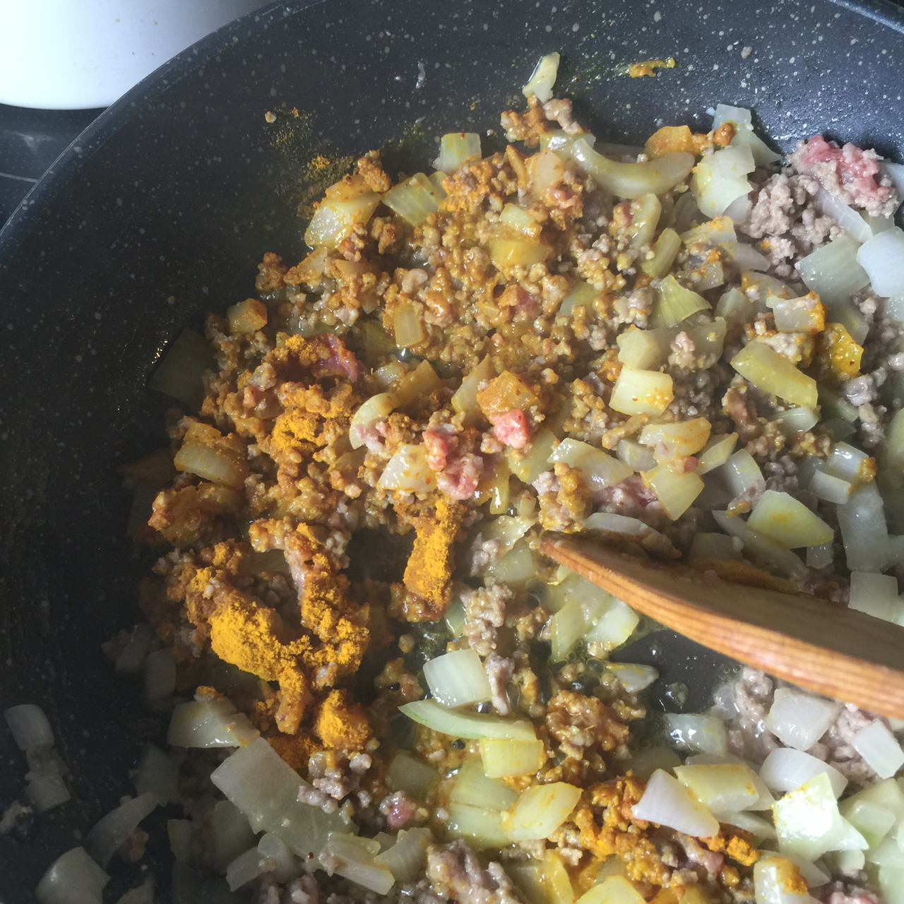玉ねぎに火が通ったら肉を加えいため、スパイスを加えしっかりとなじませる