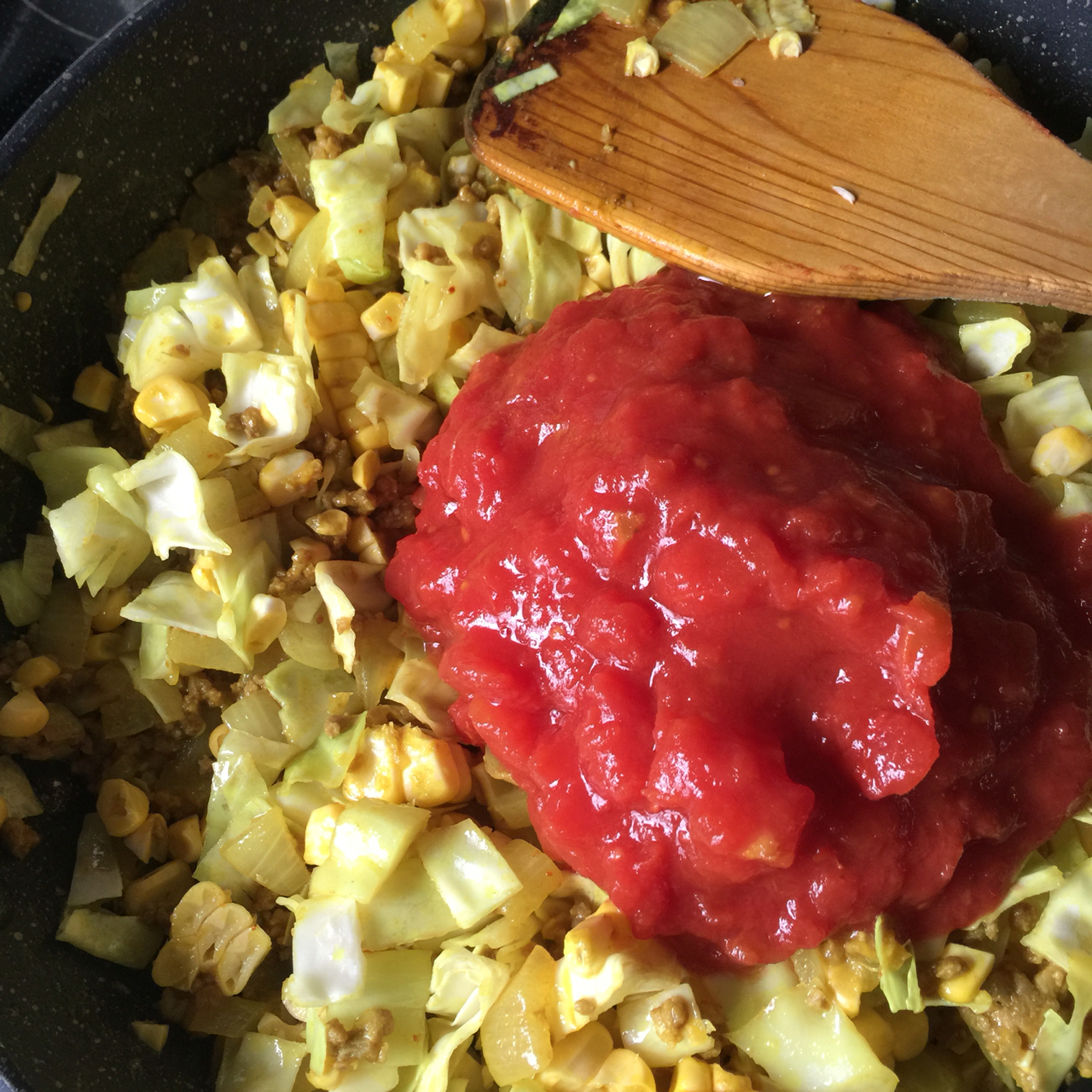キャベツ、トウモロコシを加えさっと炒めトマト缶を加え一煮立ちさせる